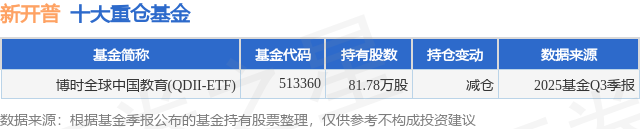 根据2025基金Q3季报公募基金重仓股数据,重仓该股的公募基金共1家,其中持有数量最多的公募基金为博时基金的博时全球中国教育(QDII-ETF)。博时全球中国教育(QDII-ETF)目前规模为3.98亿元,最新净值0.5565(1月8日),较上一交易日上涨1.38%,近一年上涨20.38%。该公募基金现任基金经理为万琼。万琼在任的基金产品包括:博时标普500ETF联接A,管理时间为2015年10月8日至今,期间收益率为273.51%;博时标普500ETF,管理时间为2015年10月8日至今,期间收益率为309.78%;博时中证500ETF,管理时间为2019年8月1日至今,期间收益率为101.6%;博时中证500ETF联接A,管理时间为2019年12月30日至今,期间收益率为84.86%。